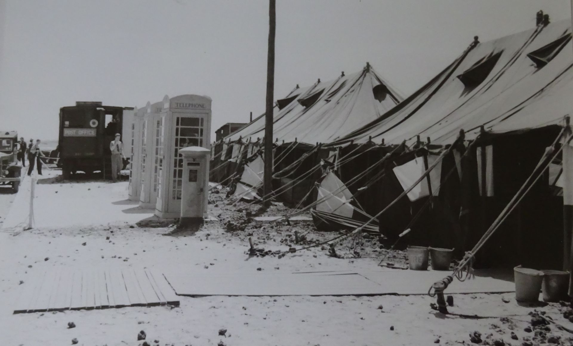 The airport was far from finished. After eighteen months of construction there was only one completed 3000 yard runway. At this time two million tons of earth had been excavated; 36,000 feet of ducting containing 60 miles of wire laid; 200 lorries, 40 excavators, 50 bulldozers used, as well as elaborate concreting equipment. More than 1000 men were housed and fed on the site.[4] However apart from the runways little else was ready.