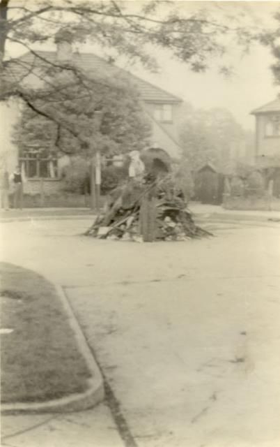 In Uxbridge there was a thanksgiving service in St Margaret’s, the Parish church, on Tuesday evening. The church was full long before the start of the service and many more people in the Market House and High Street listened to the service over a loud-speaker. Central Hall Methodist Church, and St John’s Parish Church, Hillingdon, also held services.[1] Later in the evening bonfires were lit in streets and around them people danced and sang until the early hours. Anyone with an instrument played and a piano was dragged out of a public house. Street parties were everywhere and later fireworks were let off. A garden in the Crossways was lit by floodlights and in the eastern sky searchlights were seen over the London celebrations.