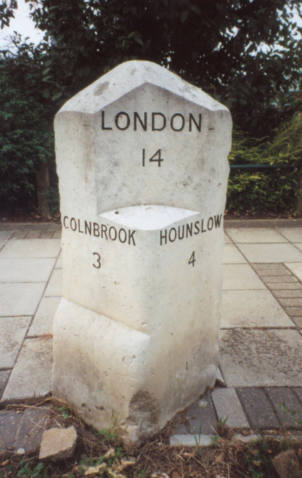 In 1741 the Colnbrook Trust erected mile stones along the seven miles of Bath Road under their administration. The stones were commissioned from Mr Woodruff of Windsor and cost £2 8s each. Although recut in the 1820s the thirteenth, fourteenth, fifteenth and sixteenth miles stones are still in place today. They show the distance between local towns as well as the total distance from Hyde Park Corner.